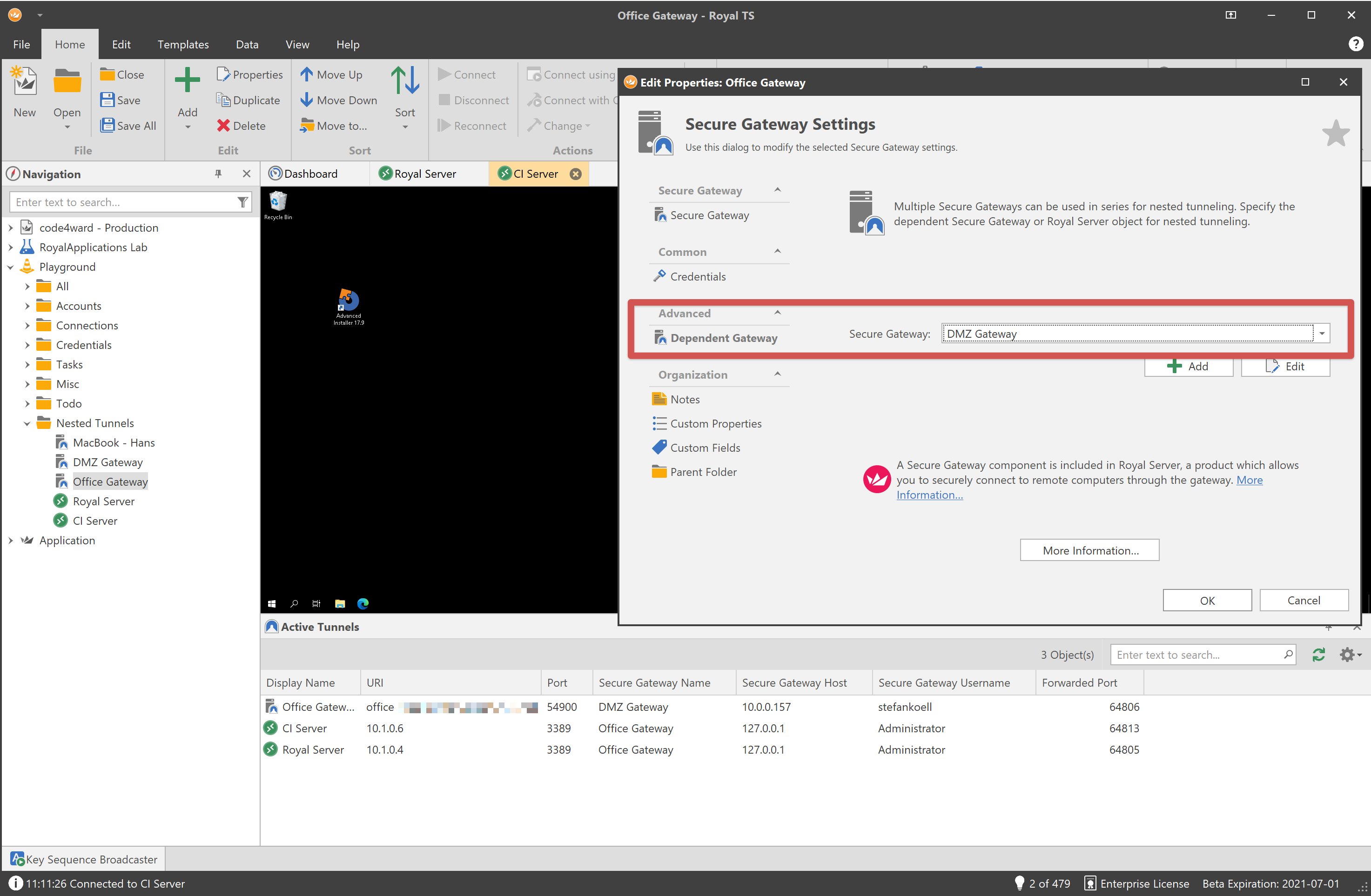 First we need to establish a tunnel to the Office Gateway through the DMZ Gateway. To do this, Royal TS will open a local port (64806 in this case) and forward all traffic from this port to the Office Gateway. The subsequent tunnels that we need to establish in order to connect to our CI Server and Royal Server will use the Office Gateway tunnel mapped to port 64806 as a dependent gateway.