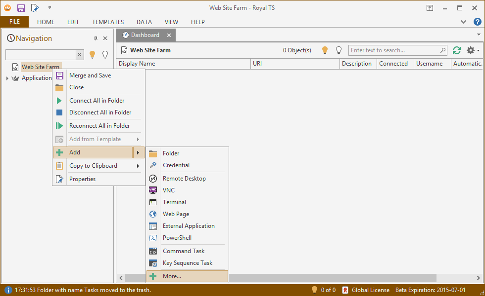 We create an empty Royal TS document (“Company Web Site Farm”) and delete all default folders (Connections, Credentials, Tasks). Then, we add a Royal Server object – it encapsulates all information that is needed to communicate with Royal Server. Typically, you have one Royal Server object for each Royal Server installation.