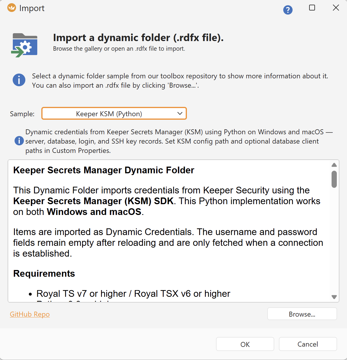 Keeper has contributed to our toolbox GitHub repository and provided a complete implementation of a Dynamic Folder script to use the Keeper Secrets Manager in Royal TS (Windows) and Royal TSX (macOS) connections.