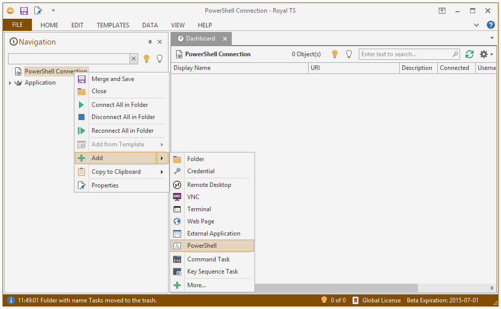 Creating a new PowerShell connection is straight forward: just add it by using the context menu: