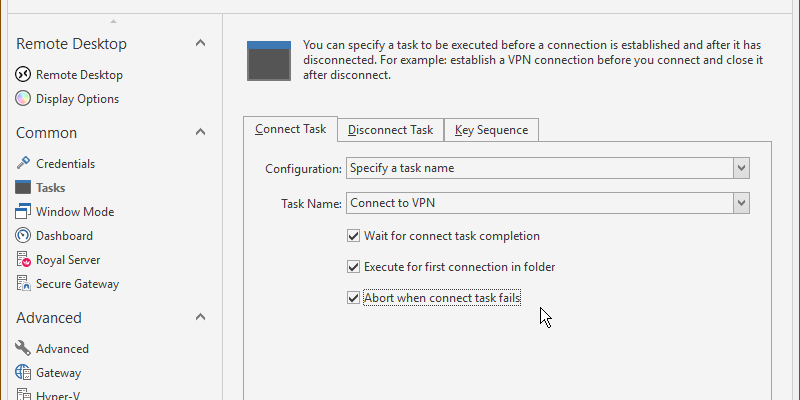 In Royal TS and Royal TSX we have two different task objects: Command Tasks and Key Sequence Tasks. Command tasks can be used to execute a specific command (such as connecting to a VPN) and key sequence tasks can be...