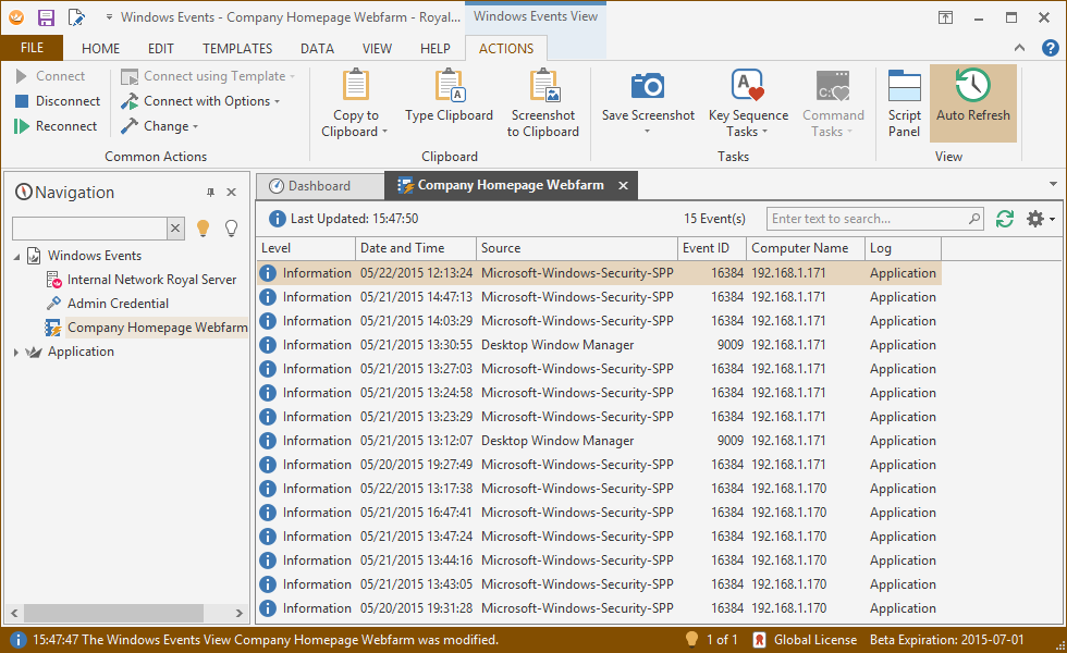 With Royal TS/X it’s easy to configure a Windows Events connection: specify the Computer Name, the Royal Server, Credentials, etc. as usual.