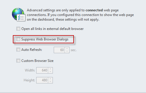 A web page connection can now be configured to suppress all web browser dialogs (like JavaScript errors, ActiveX installation prompts, etc.). You can find the option in the Advanced property page of the web page connection properties: