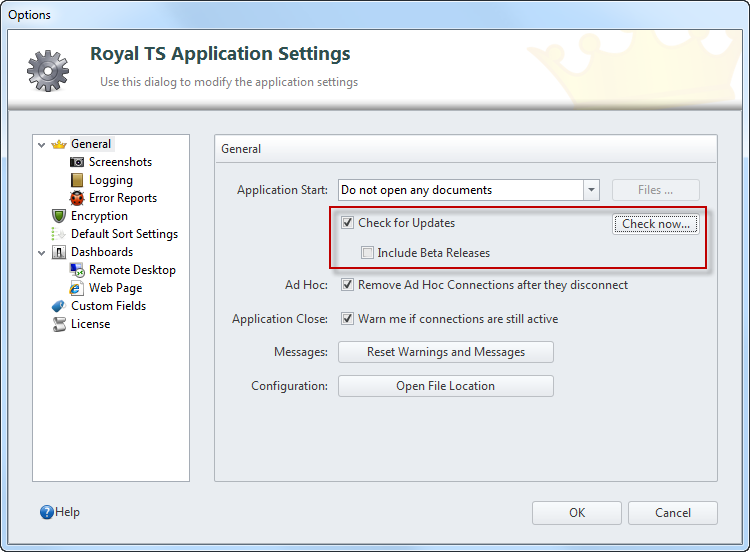 Thanks again to all the beta testers out there. Your error reports helped us fix many many bugs already. Since we will now provide new builds on a weekly or sometimes bi-weekly basis, we’ve improved the update check routines. In the Options dialog you can now configure an update check when Royal TS starts and you can also include beta releases in the check. If you are running a beta version, the “Include Beta Releases” setting will be ignored and Royal TS will always inform you about new beta releases. The Check now… button will execute the check immediately: