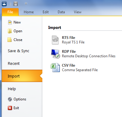 Click in the Ribbon on “File” and in the Backstage area on “Import”. This shows you the possible files Royal TS V2 can import at the moment: RDP File, CSV File and RTS File. RDP and CSV file imports are topic for another blog post – so stay tuned.