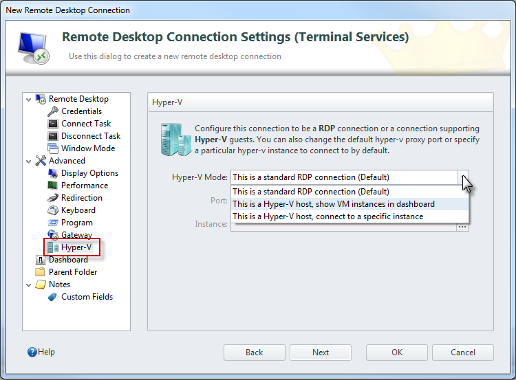 This is a Hyper-V host, show VM instances in dashboard Selecting this option makes sense if the connection you’ve created points to a Hyper-V host. This will show both the “Hyper-V Instances” pane allowing you to control all hosted instances from the dashboard and the “Terminal Services Sessions” pane.