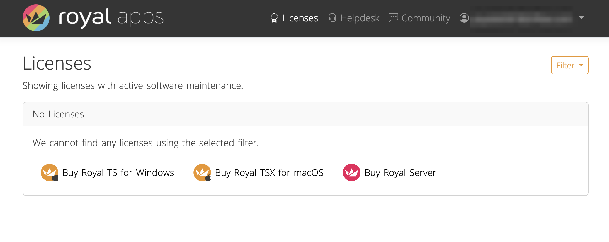 Clicking on either Licenses, Helpdesk or Community will redirect you to various pages: