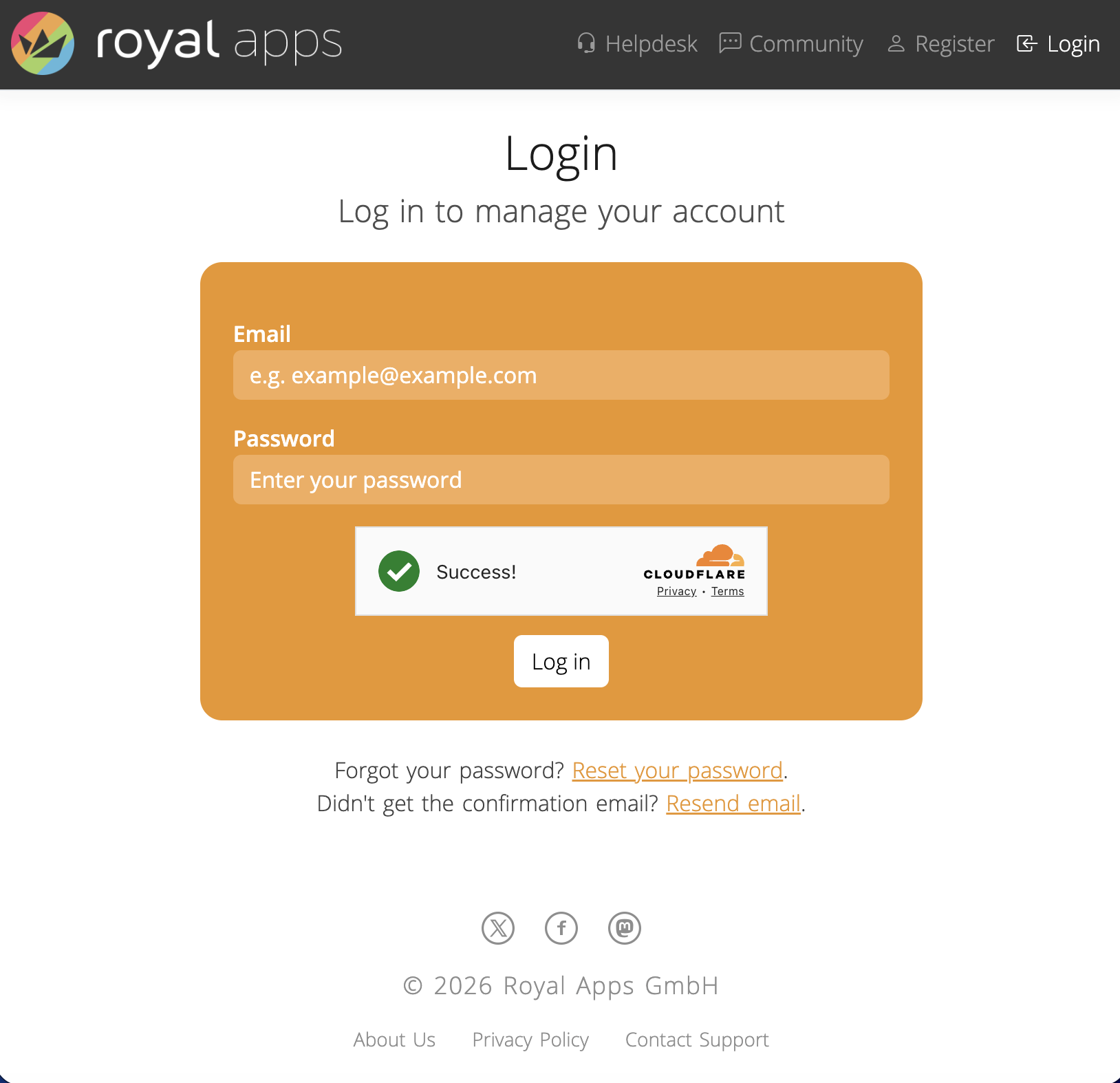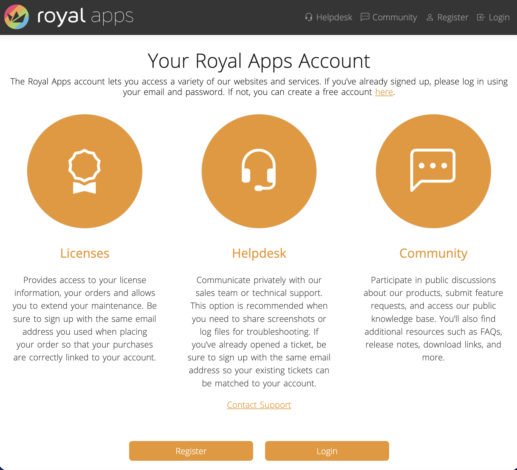 In order for you to use the portals, head over to royalapps.com/go/my-register and sign-up for a new Royal Apps Account using the email which was previously used to purchase a license or which was used to create a support ticket. Otherwise, choose an email to your liking: