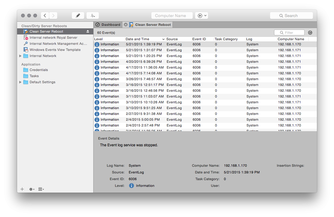 We want to know when a specific list of servers had a clean server reboot: