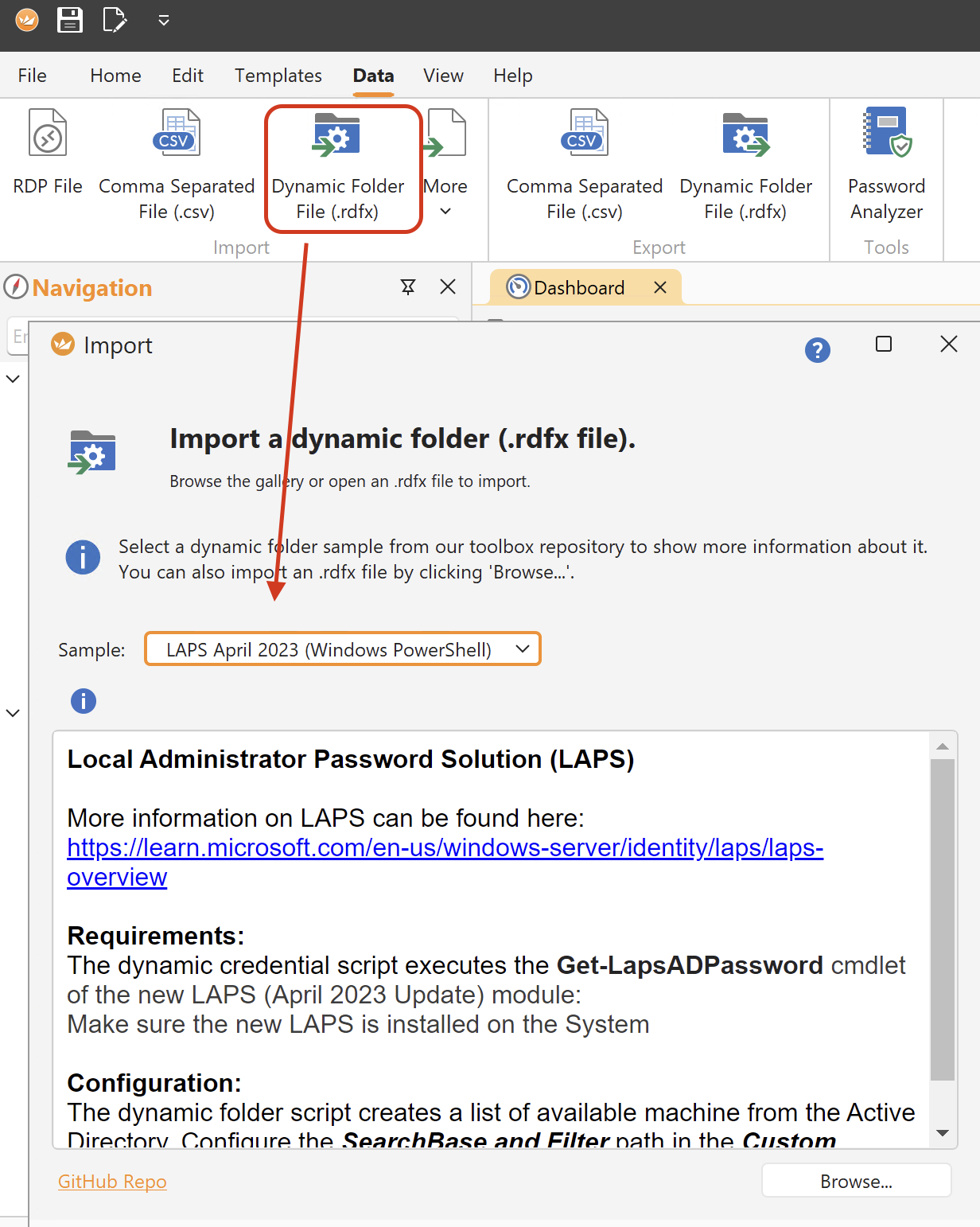 To import it, click on Data > Dynamic Folder File (.rdfx) > Microsoft Windows > LAPS April 2023 (Windows PowerShell):