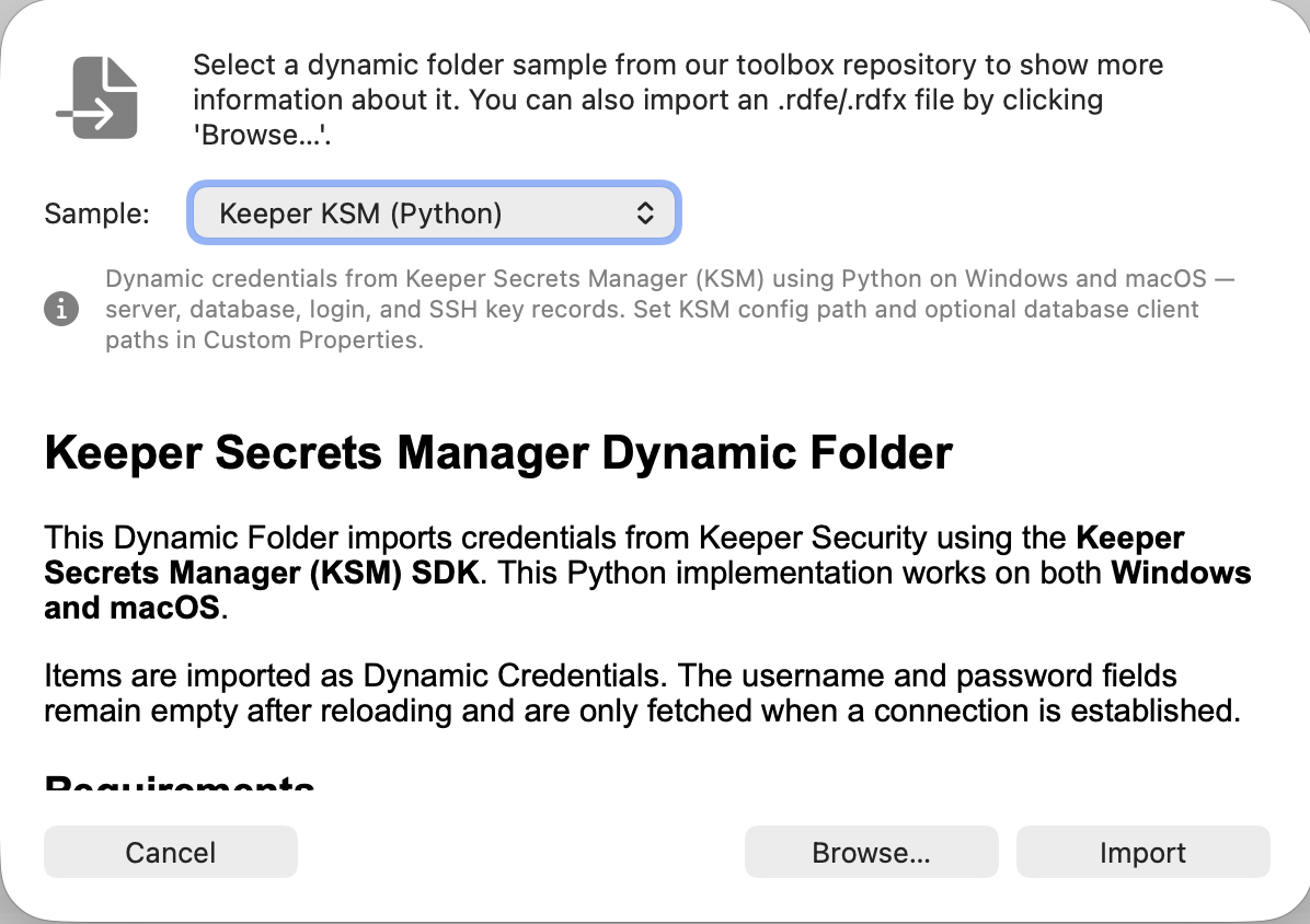 File > Import > Dynamic Folder > Keeper > Keeper KSM (Python):