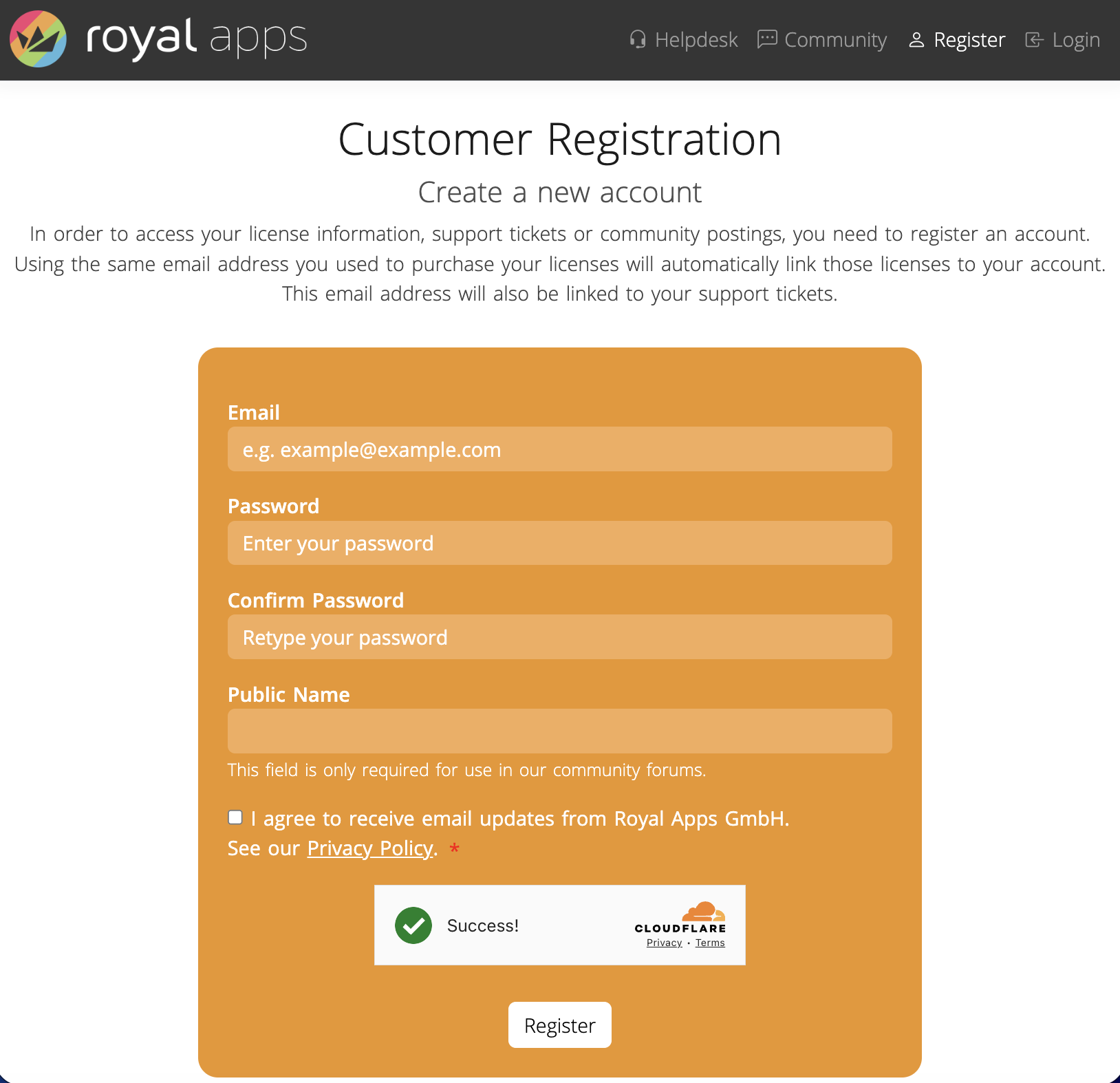 In order for you to use the portals, head over to royalapps.com/go/my-register and sign-up for a new Royal Apps Account using the email which was previously used to purchase a license or which was used to create a support ticket. Otherwise, choose an email to your liking: